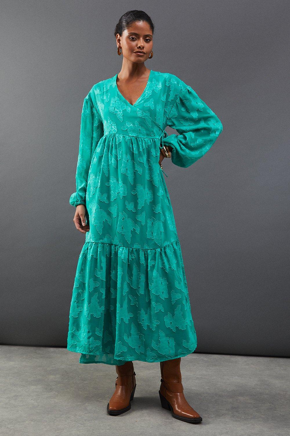 Warehouse Womens Burnout Chiffon Wrap Smock Midi Dress - Green - Size 8 UK | Warehouse Sale | Discount Designer Brands