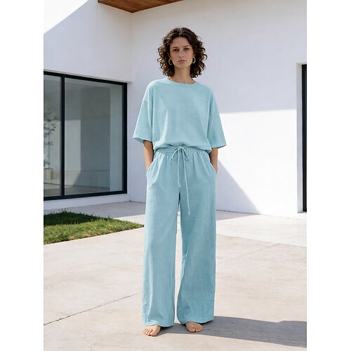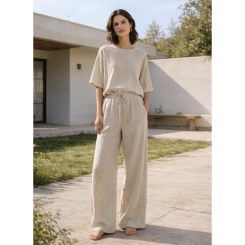 15% lino set da donna in lino misto lino set due pezzi basic colore puro tasca elastico in vita maglietta pantaloni strada quotidiano manica lunga girocollo nero bianco blu navy marrone chiaro blu estate primavera