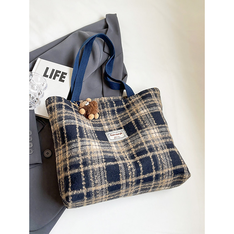 Women's Christmas Plaid Tote Bags – Large Small Sizes, Polyester Fabric with Pom-Pom Charm, Festive Style for Holiday Shopping Gift Giving