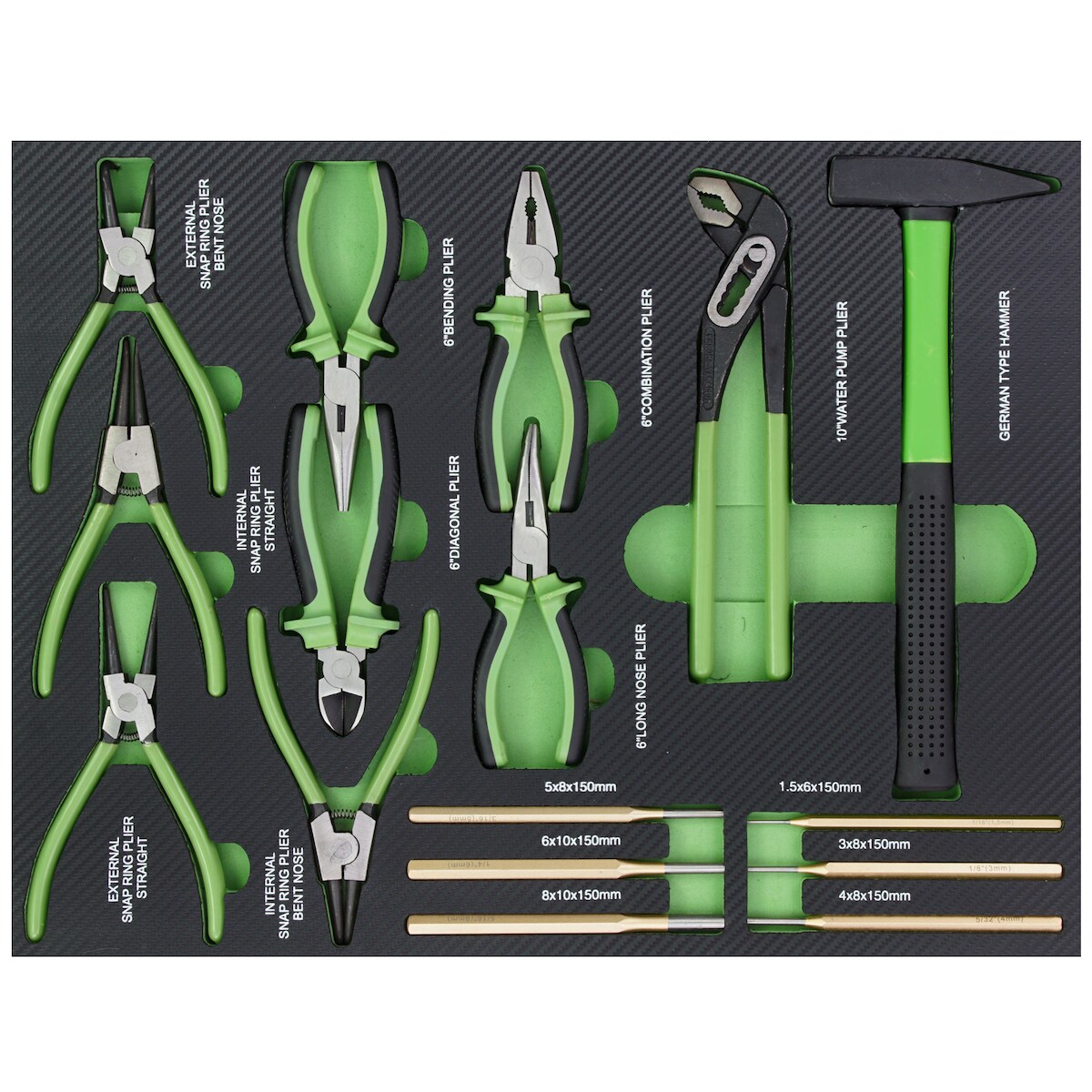 Baumarktplus Profi Werkstattwagen Einlage Hammer, Zangen und Durchschläger 16 tlg. Schaum 515x395x40mm grün