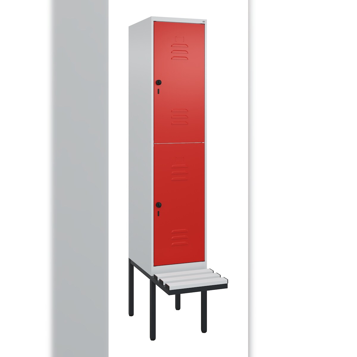 C+P Spind Classic PLUS, Kunststoff schwebende Sitzbank, 2 Abteile, HxBxT 212x40x82cm, Sicherheitsdrehriegel, Hellgrau/Rot von PROREGAL