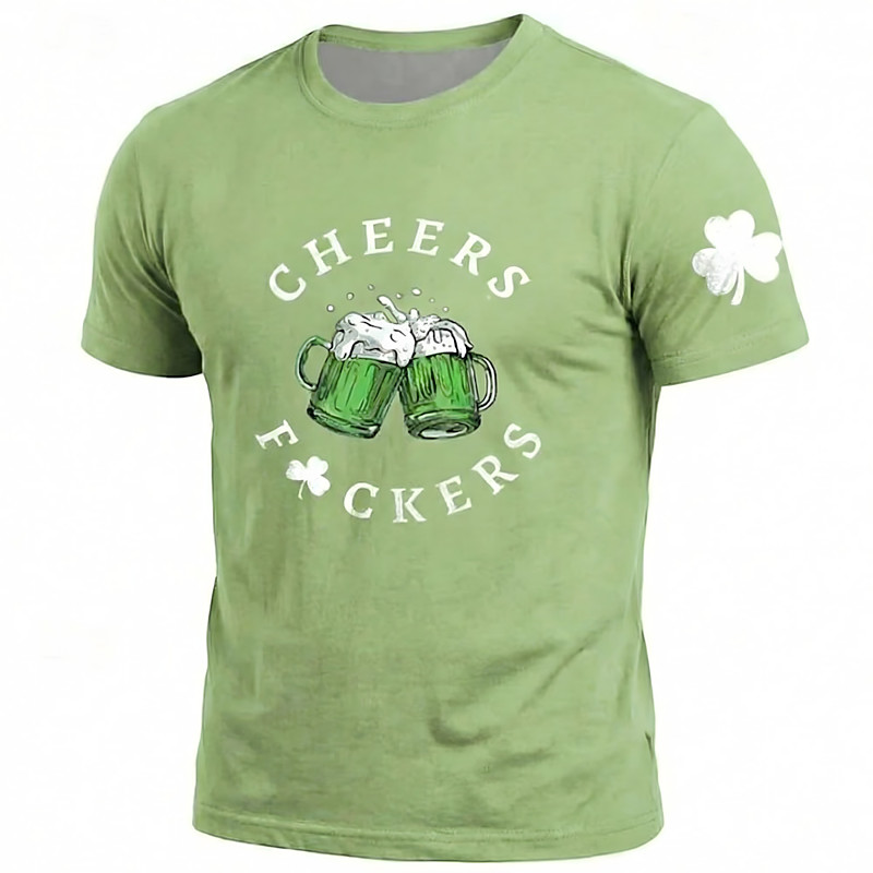 St Patricks Day Cheers Fckers Funny Green Beer Mugs T Shirt Washed Cotton Blend Irish Shamrock Graphic Tee for Men Women Clothing Apparel S M L XL XXL XXXL