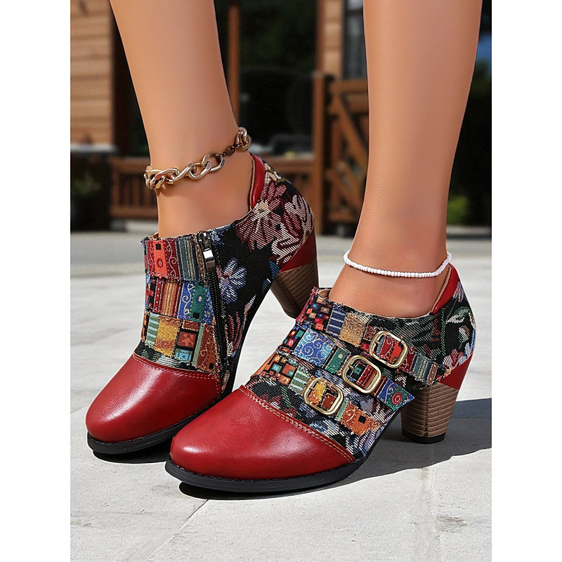 Women's Vintage Floral Lace-Up Oxford Shoes – Multi-Color Faux Leather and Fabric Patchwork Chunky Heel Oxfords with Round Toe, Retro Victorian Style for Casual Wear, Parties, and Fall Winter Outfits