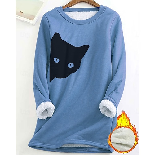 Damen Pullover Sweatshirt Tiermotiv Katze Mode Basic Lässig Langarm Rundhalsausschnitt Lange Oberteile Straße Alltagskleidung Lässig Druck Mit Fleecefutter Schwarz Rosa Dunkelpink Blau Herbst Winter