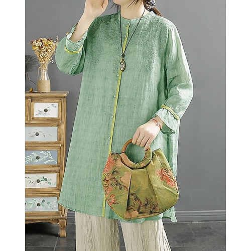 Damen Baumwoll-Leinen-Hemden Bluse Einfach Elegant Vintage Stilvoll Dreiviertelarm Hoher Ausschnitt Lange Oberteile Täglich Ferien Ausgehen Knöpfe Champagner Rote Grün Sommer Frühling