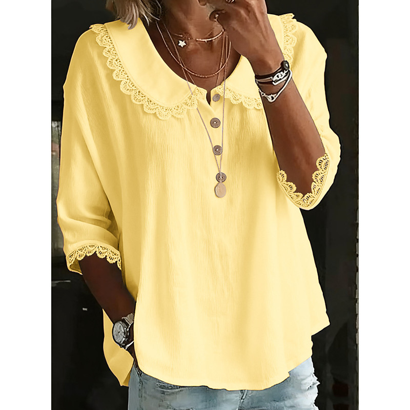 Women's Blouse Solid Color Stylish Casual 3/4 Length Sleeve Shirt Collar Regular Tops Daily Lace Trim Blue White Yellow Pink Summer Spring Fall