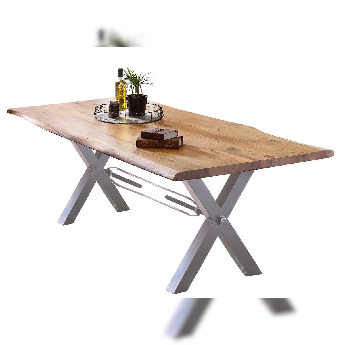 SIT Möbel Esstisch Baumkante | 180 x 90 x 78 cm | Platte 56 mm Akazie natur | X-Gestell Metall antiksilbern | 15872-40 | Serie TABLES & CO