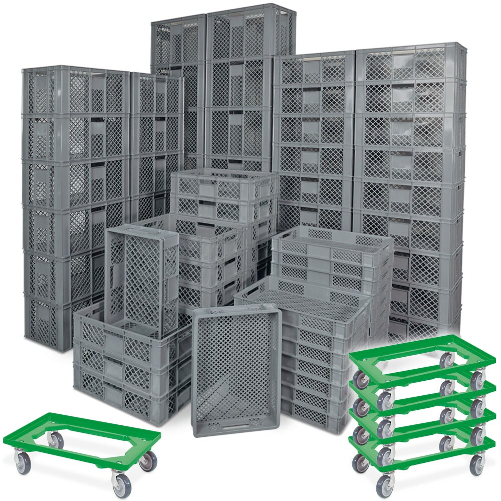 BRB 78 Bäckerkisten in 5 Größen, 600x400 mm, H 90 mm - 410 mm, grau + 5 Roller, grün