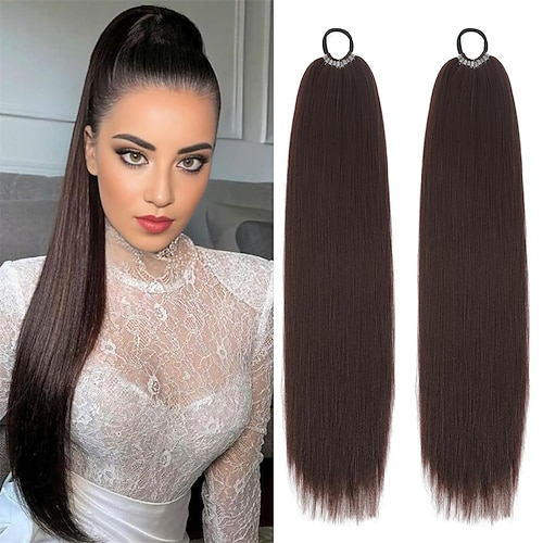 2 Packungen lange geflochtene Pferdeschwanz-Extensions mit Haargummis, natürliches weiches Kunsthaar, gerade, umwickelbare Haarverlängerungen für schwarze Frauen (braun, 24 Zoll (2er-Pack))
