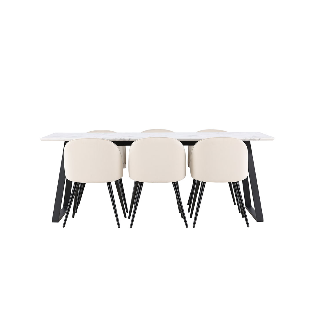 Malaga Essgruppe Esstisch 90x200cm weiß und 6 Skagen Stuhl velour beige.