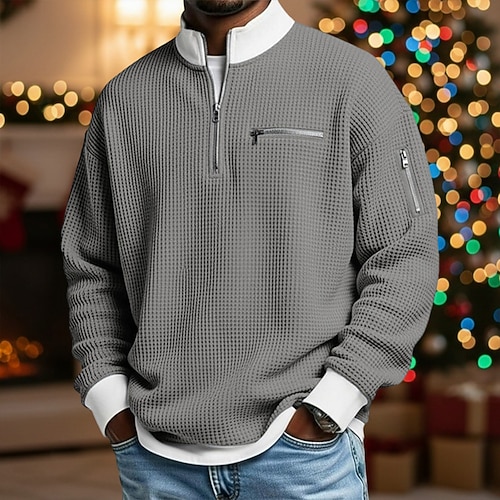 Per uomo Maglietta Waffle Maglietta Manica Lunga Mezza zip Autunno Autunno Inverno Tinta unica Tradizionale / Vintage Casual Blocco di colore Tasca con cerniera All'aperto Casa Sport Outdoor Blu
