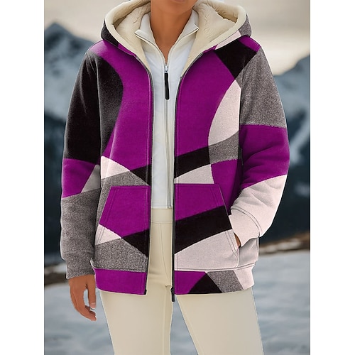 Per donna Cappotto Invernale Caldo Cerniera Tasca Blocco di colore Stampato Moda Casual Geometrico Streetwear Casuale Corto Con Cappuccio Vestibilità regolare Manica Lunga Capispalla Blu Rosso Viola