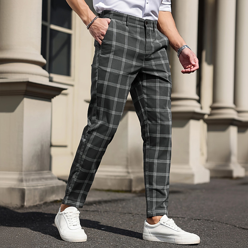 Men's Plaid Dress Pants Mid Waist Business Casual Formal Dailywear Zipper Pocket Summer Spring Fall 3D Print Black Gray