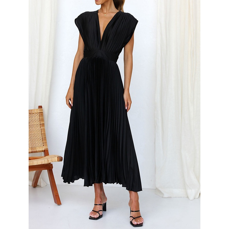Women's Midi Dress A Line Dress Pleated Dress Elegant Party Cocktail Outdoor Party Wedding Guest Regular Fit Solid Color Short Sleeve V Neck Black Champagne Red Brown Summer Spring
