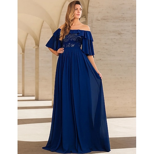 Abito da Sposa O-Line fino al Pavimento Abiti Formali Abito da Sera Abito per la Madre della Sposa Maniche Corte Spalla Scoperta Elegante Vintage Festa con Pieghe