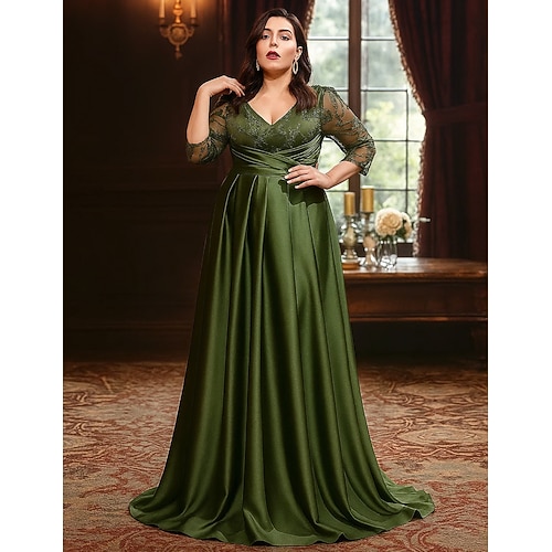 Abito da invitato a matrimonio lungo fino al pavimento in A-line abiti formali abito da sera abito per madri della sposa maniche lunghe collo a V elegante vintage plus size formale spandex con pieghe