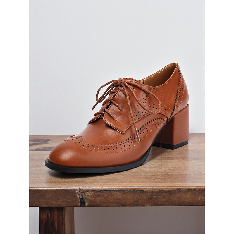 Women's Brown Lace-Up Oxford Heels with Low Block Heel and Brogue Detailing, 1950s Vintage Edwardian Style Dress Shoes for Cosplay, Retro Parties Daily Fashion Outfits