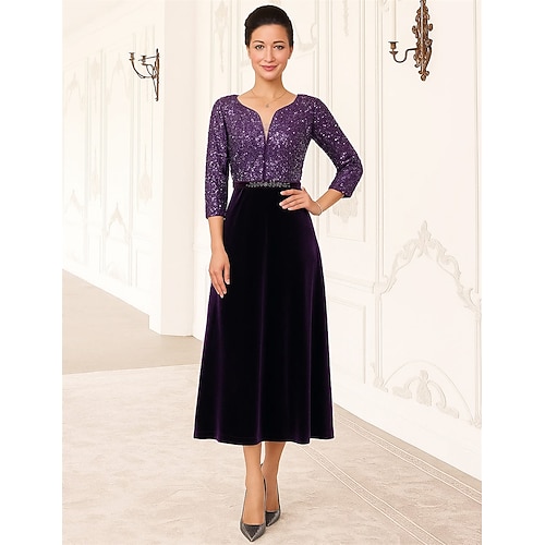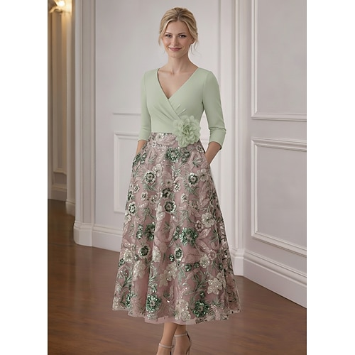 Linea ad A Lunghezza alla caviglia Lunghezza Tè Vestito da Festa Abito da Cocktail Abito da invitata a nozze Abito da cerimonia per signora Manica 3/4 Scollo a V Elegante Vintage Formale Cocktail