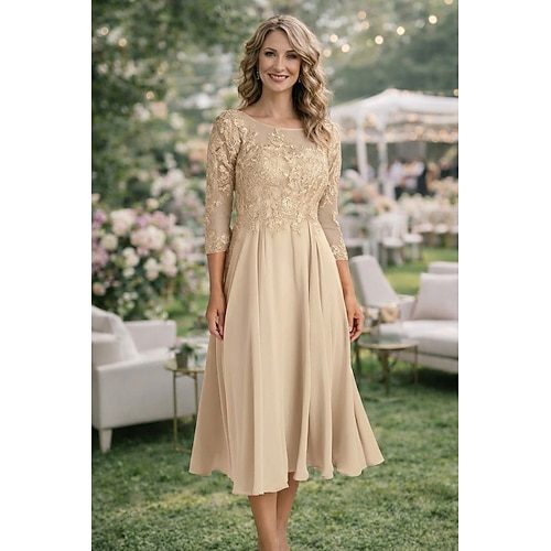 Linea ad A Lunghezza Tè Vestito da Festa Abito da Cocktail Abito da invitata a nozze Abito da cerimonia per signora Manica 3/4 Girocollo Elegante Ospite di nozze Festa di fidanzamento Chiffon Pizzo