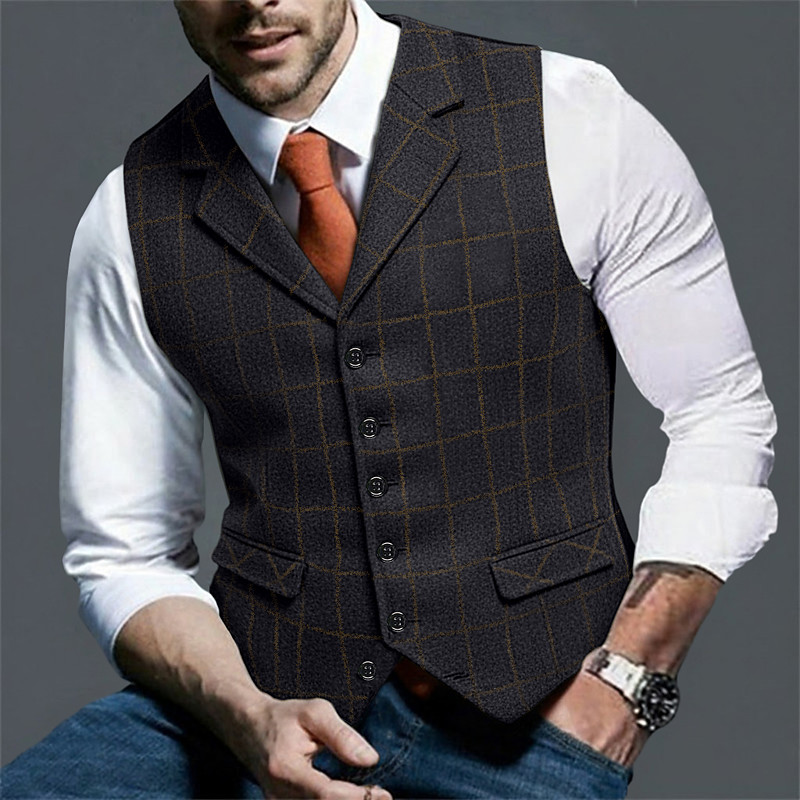 Men's Vest Suit Vest Waistcoat Wedding Work Business Holiday Formal Gentle Spring Fall Polyester Plaid Shirt Collar Slim Brown Light Grey Dark Gray Vest