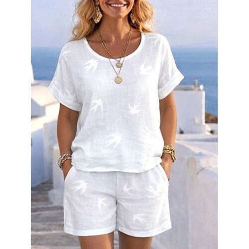 Completi di pantaloni corti in lino sintetico da donna top bolero maniche corte collo tondo colore solido moda streetwear quotidiano casual all'aperto bianco estate vestibilità morbida
