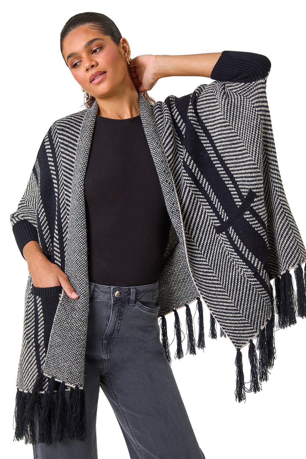 Roman Womens Check Fringe Knit Cardigan - Navy - Size 10 UK | Roman Sale | Discount Designer Brands
