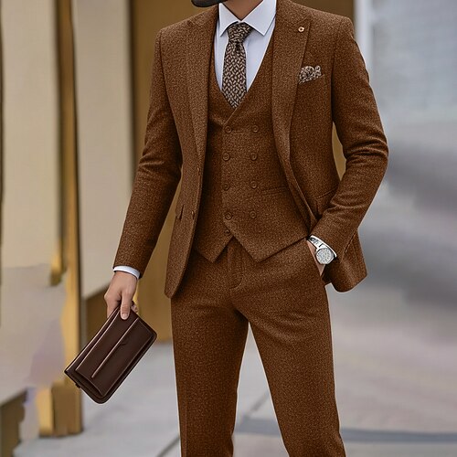 Uomo Matrimonio Feste Completi in Tweed Bavero a lancia Nero Marrone Quotidiano Tinta unita Vestibilità su misura 3 pezzi Monopetto Due Bottoni