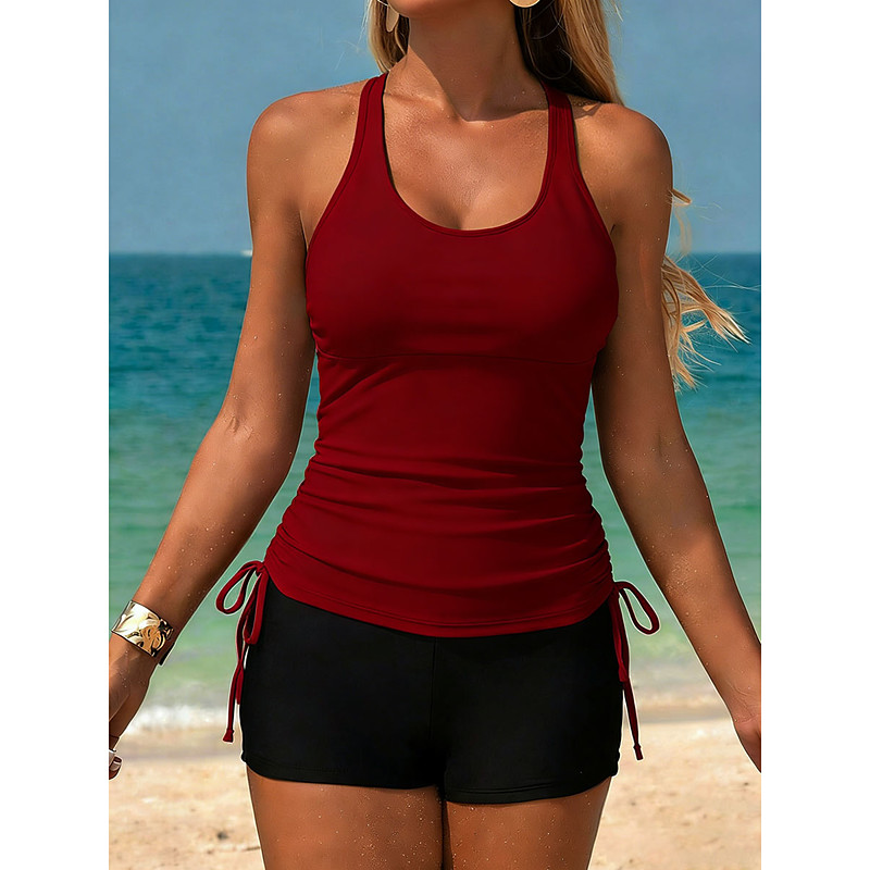 Women's Tankini 2 Piece Swimsuit Ruched Shorts Backless Vacation Beach Wear Solid Color Scoop Neck Sleeveless Bathing Suits