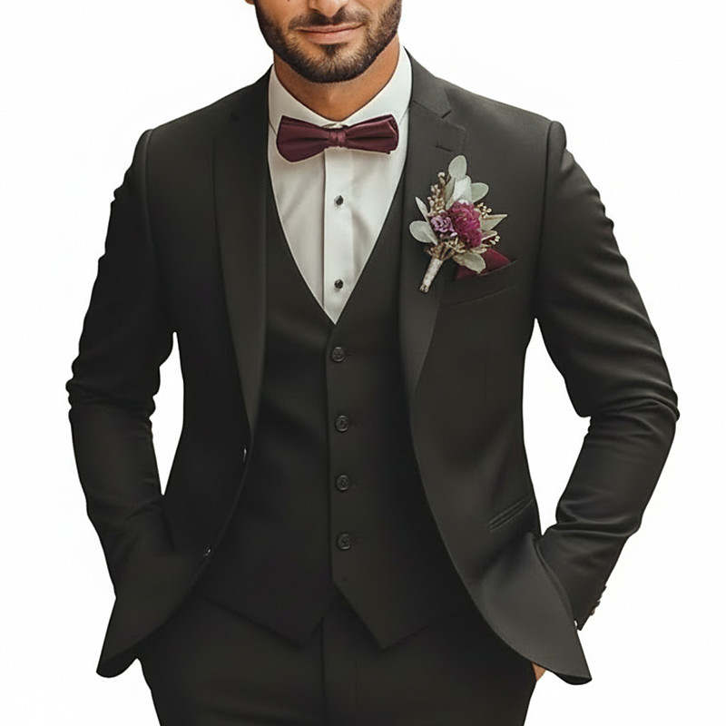 Men's Winter Wedding Semi Formal Business Suits Notch Lapel Black Burgundy Business Formal Solid Colored Tailored Fit 3 Piece Single Breasted Two-buttons