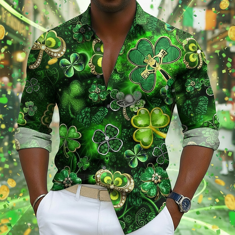 St. Patrick's Day Shirt for Men - Lucky Clover Shamrock 3D Print Long Sleeve Top with Lapel Collar Irish Graphic St. Paddy's Day Top