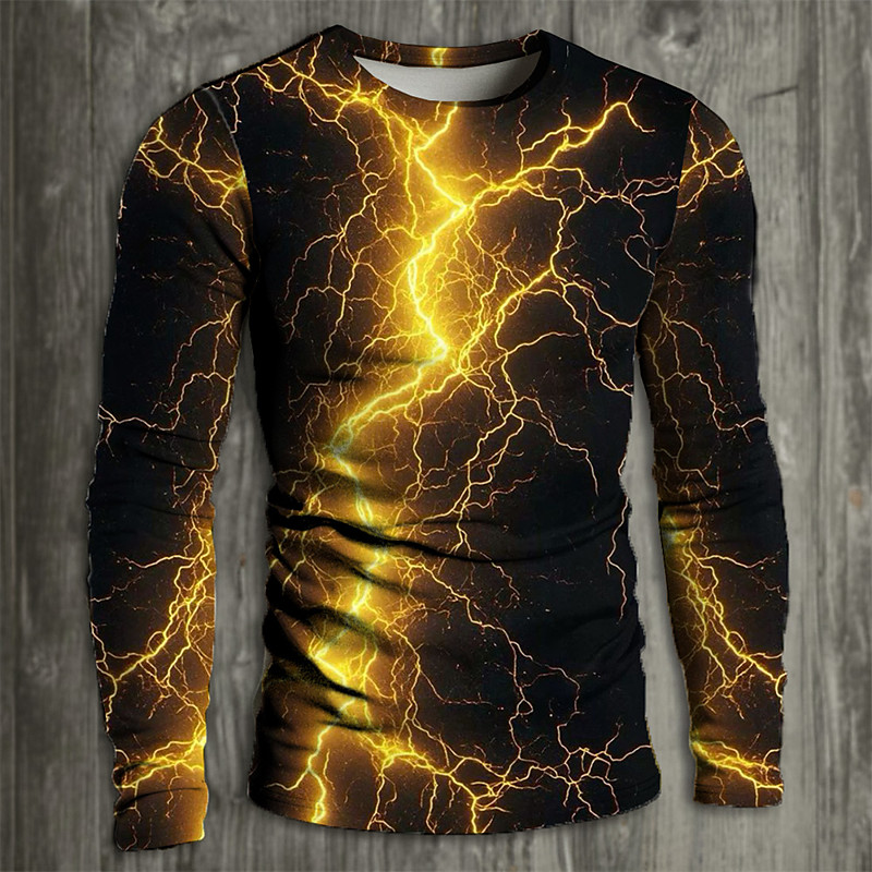 Men Long Sleeve T Shirt 3D Golden Lightning Print Cool Thunderbolt Graphic Casual Streetwear Hip Hop Pullover Tops Clothing Apparel S M L XL XXL XXXL