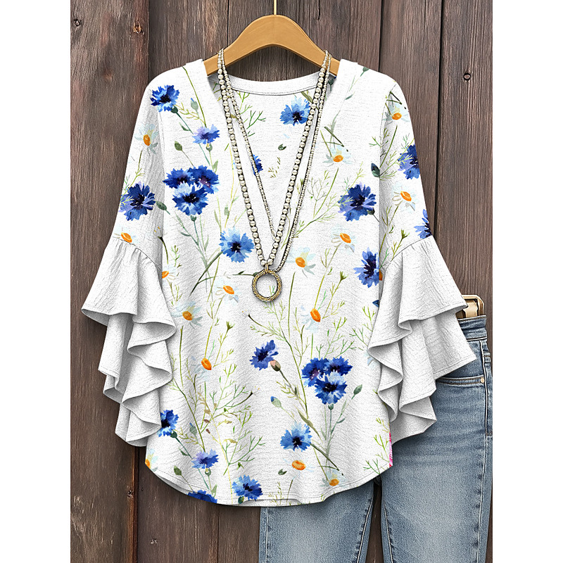 Women's Retro Blouse Layered Ruffle Sleeve Tops Vintage Floral Graphic Bohemia Vintage Daily 3/4 Length Sleeve Regular Tops Daily Holiday Vacation Wear Print White Blue Dusty Blue Orange
