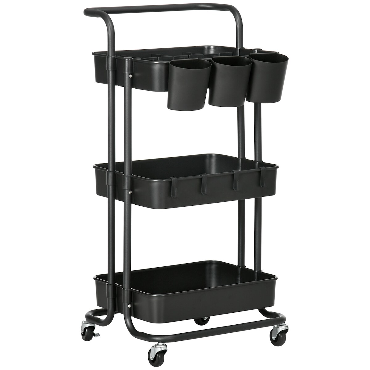 MODFU Servierwagen Rollwagen Stahl Schwarz 42x38x87 cm mit 3 abnehmbaren Körben 4 Haken 5 Trennwänden Griff und Rollen mit Bremsen