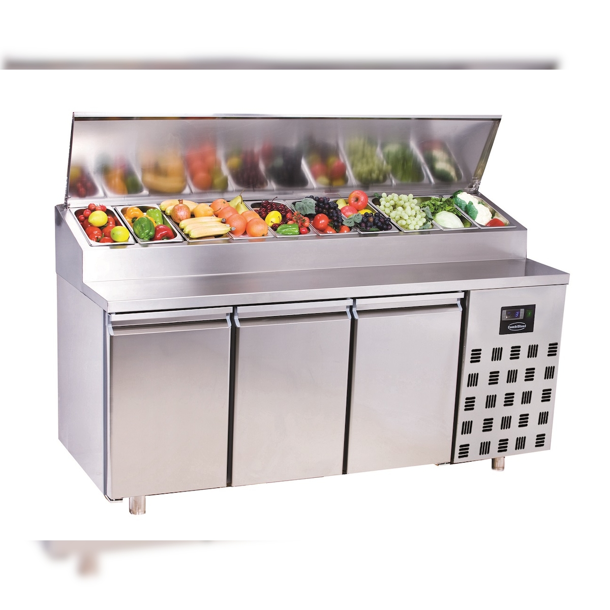 Gekühlte Saladette ANOLIS | 3x Tür | 10x 1/3 GN-150 mm | HxBxT 109x186,5x70cm | +2/+8°C | Edelstahl | + CHEFGASTRO Geschirrtuch