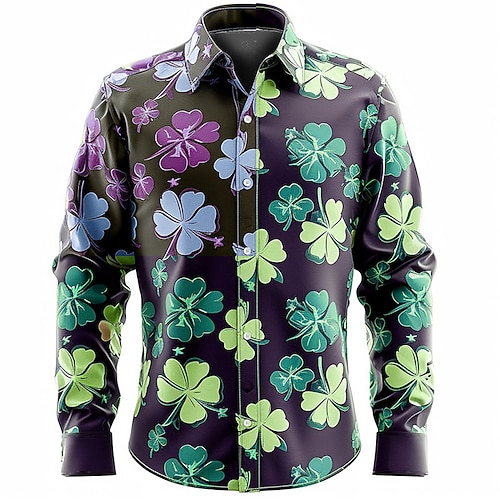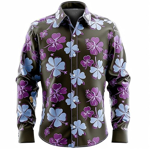 A quadrifoglio Moda Casual Per uomo Camicie stampate Per eventi Da mare Festival Primavera estate Collo ripiegabile Manica lunga Verde scuro, Viola, Verde S, M, L Tessuto elasticizzato a 4 vie Camicia