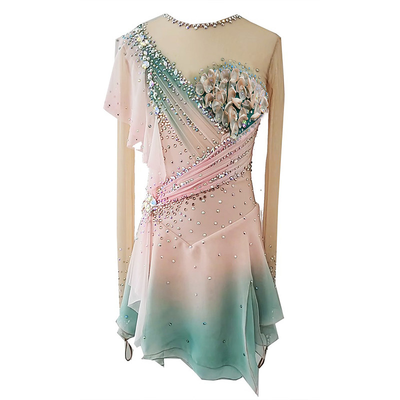 Figure Skating Dress Women's Girls' Ice Skating Dress Green Patchwork Thumbhole Spandex Mesh Stretchy Training Practice Professional Skating Wear Thermal Warm Crystal / Rhinestone Long Sleeve Ice