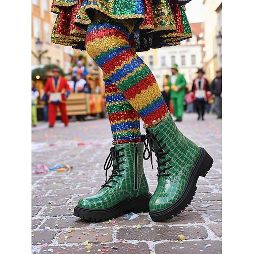 Stivali da combattimento in vernice verde con stampa coccodrillo per donne – scarpe alla caviglia lucide con lacci per il Carnevale festival e stile di strada audace