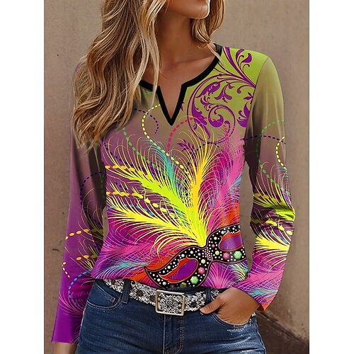 Maglietta da donna Carnival con grafica geometrica vintage alla moda a maniche lunghe collo a V ampio stampa rosa viola verde primavera inverno