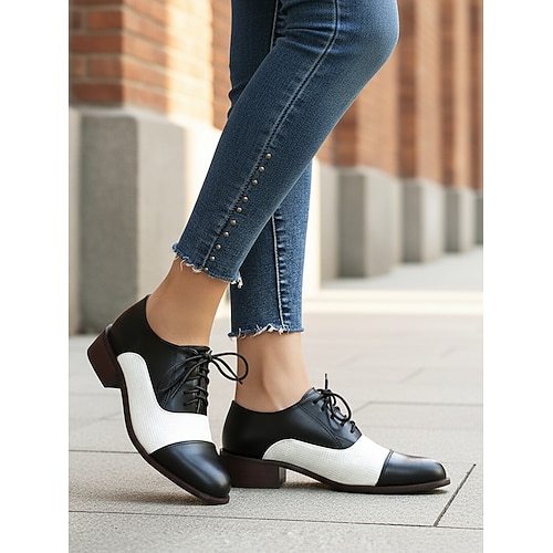 scarpe oxford da donna retrò anni '50 in bianco e nero: design classico con lacci, comodo tacco a blocco, ideali per l'uso quotidiano e le uscite casual
