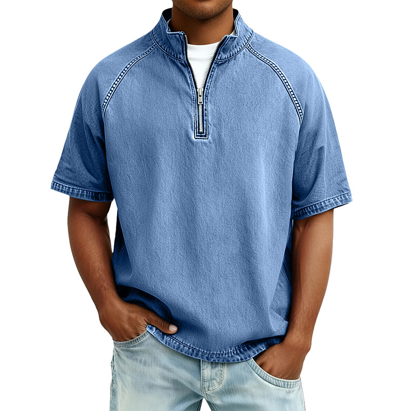 Men 100% Cotton Acid Wash Shirt Tee Top Short Sleeve Stand Collar Spring Fall Fall Winter Plain Vintage Streetwear Casual Zip Up Basic Casual Home Street Light Blue Black Brown Top Tee for Men