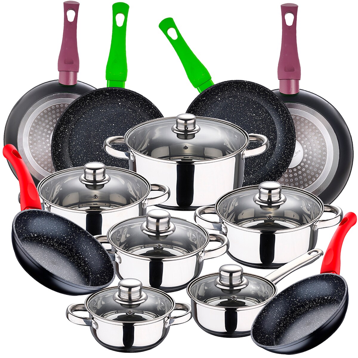 San Ignacio - Cassel Kochgeschirr-Set: 6 Töpfe mit Deckel mit Jolie-Pfannenset (18/20/22/24/26/28 cm), Edelstahl/geschmiedetes Aluminium