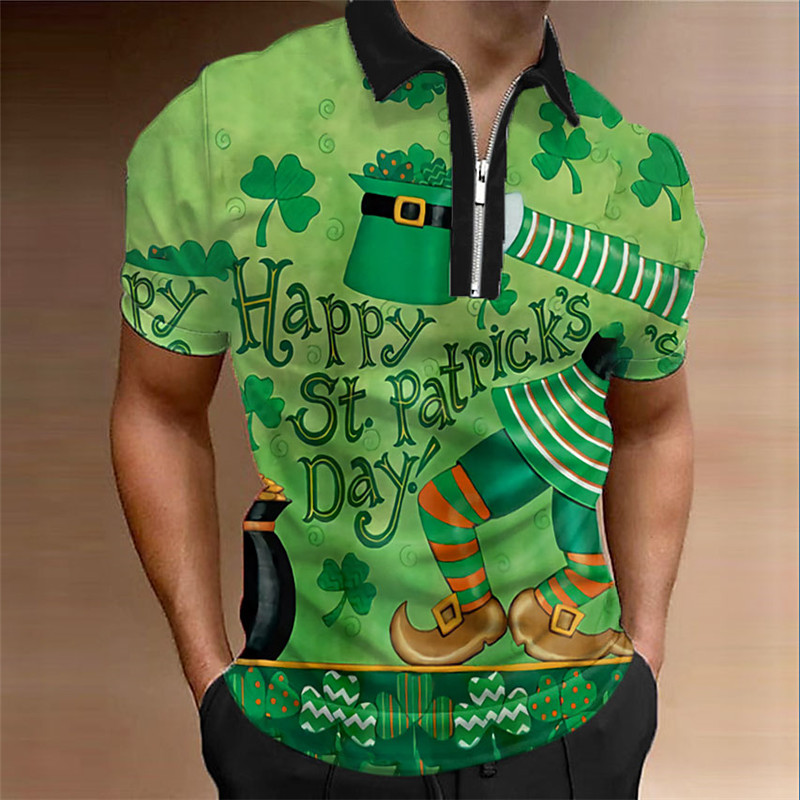St.Patrick's Day Men's Polo Shirt Golf Shirt Zip Polo Cartoon Letter Saint Patrick Day St. Patrick's Day Clover Turndown Green Outdoor Street Short Sleeves Zipper Print Clothing Apparel Fashion