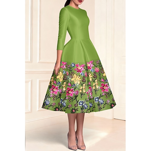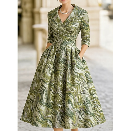 Linea ad A Lunghezza Tè Vestito da Festa Abito da Cocktail Abito da invitata a nozze Abito da Sera Elegante Vintage Manica 3/4 Colletto a Camicia Matrimonio Formale Jacquard con Tasca