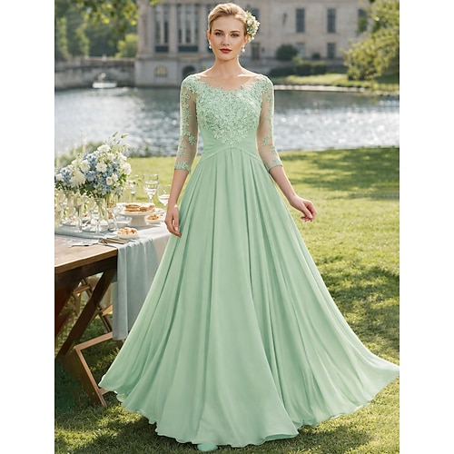 Linea ad A Lunghezza al pavimento Abito da invitata a nozze Abito Formale Abito da sera Abito da cerimonia per signora Manica 3/4 Collo gioiello Elegante Ricevimento di matrimonio Chiffon Pizzo con