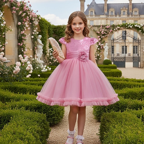 Blumenmädchenkleid Mädchen Formelle Kleidung Hochzeitskleidung Party Hochzeit Formell Niedlich Formell Prinzessin Netz Einfarbig Kurzarm Rundhalsausschnitt Rosa Rote Ab 4 Jahren