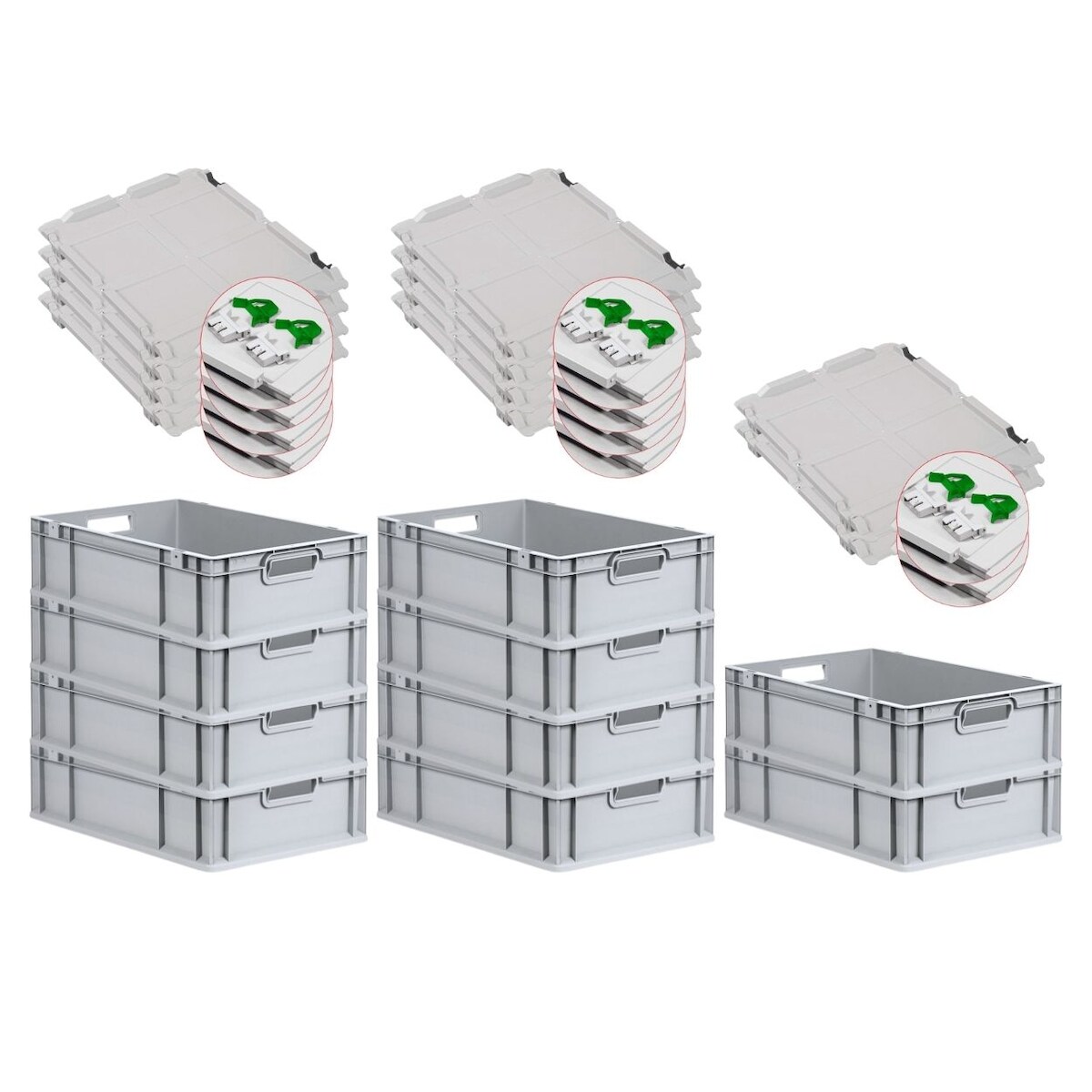 PROREGAL 10x Eurobox NextGen Grip mit Scharnierdeckel & grünen Verschlüssen | HxBxT 17x40x60cm | 34 Liter | Griffe offen | Glatter Boden