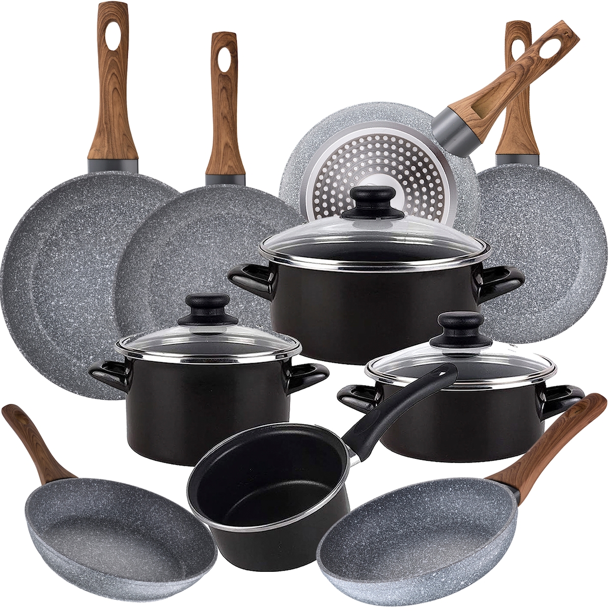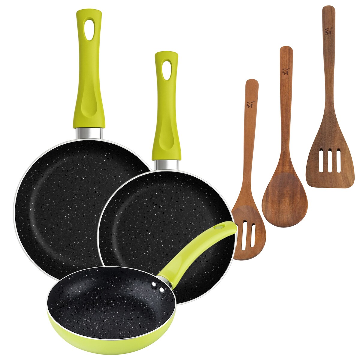 BERGNER - Set aus 3 Pfannen Ø20/Ø24/Ø28 cm gepresstes Aluminium Molen Grün Set 3 Küchenutensilien aus Akazienholz