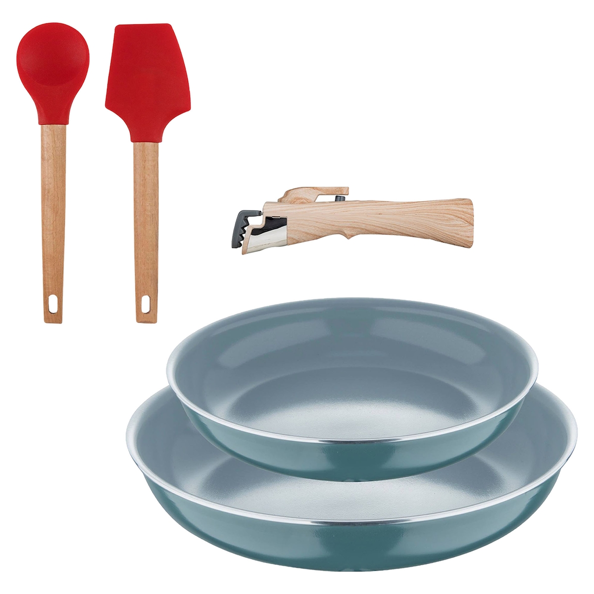 BERGNER - Set aus 2 Pfannen Ø24/28 cm aus recyceltem gepresstem Aluminium Grün mit abnehmbarem Griff mit Set aus 2 Küchenutensilien EXCALIBUR