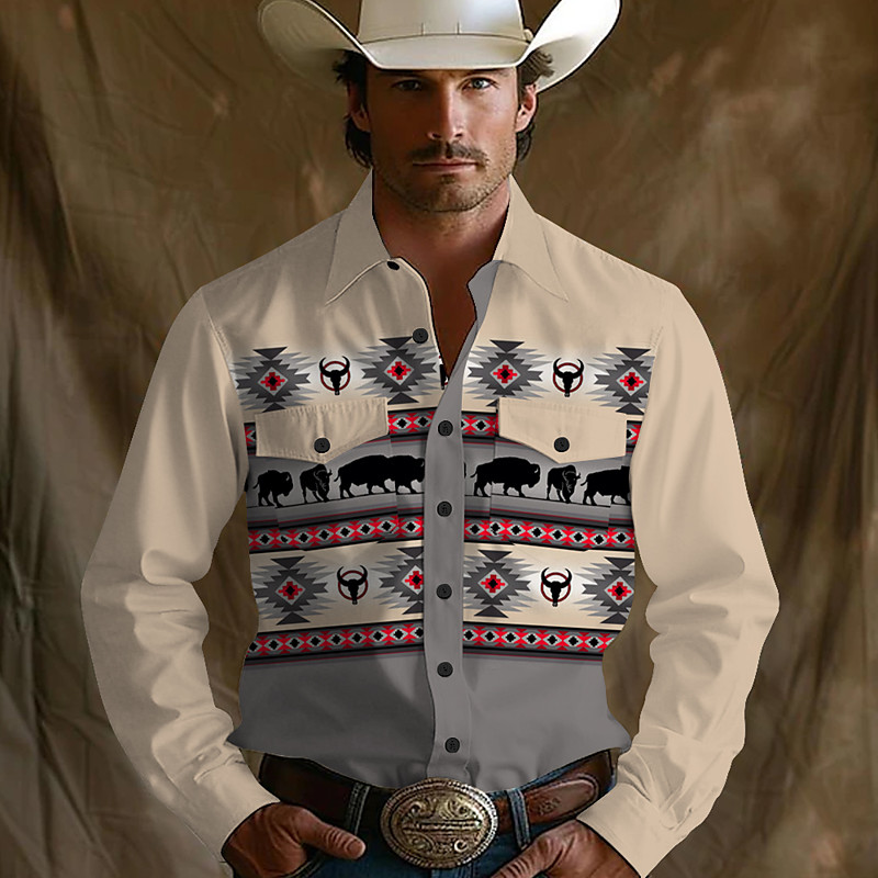 Men's Aztec Ethic / African Western Shirt Button Up Shirt Cowboy Shirt Long Sleeve Vintage Retro Outdoor Camping Hiking Spring Fall Turndown 3D Print Front Two Pockets Linen Like Shirt Blue Khaki
