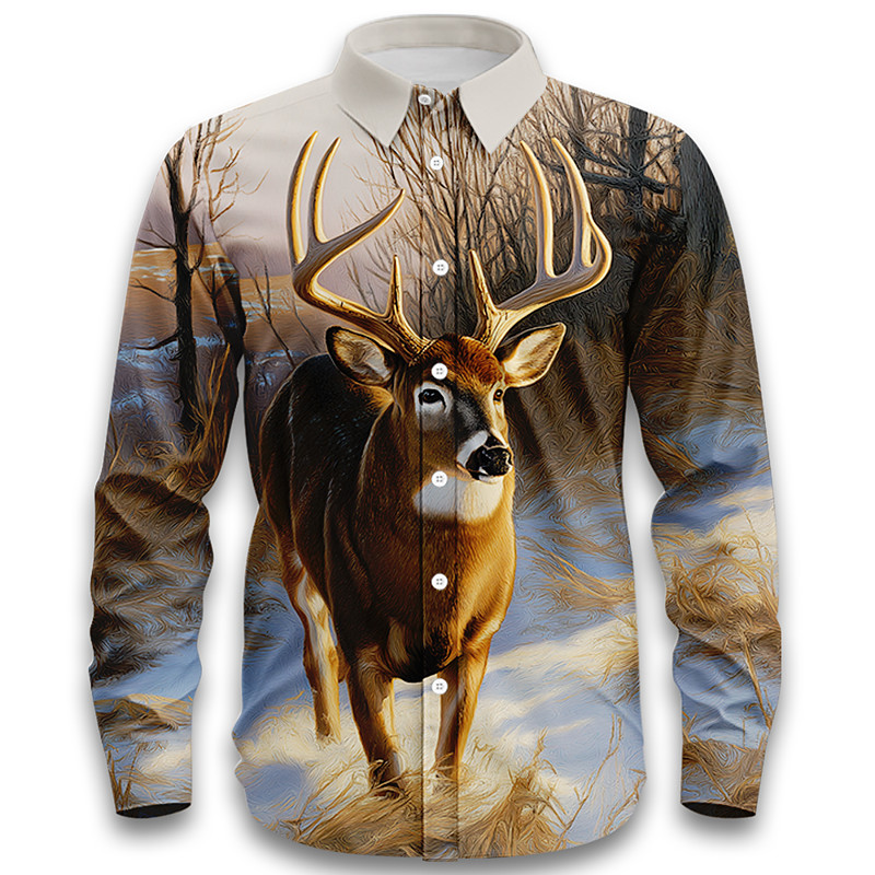 Men's Reindeer Nature Landscapes Forest Shirt Button Up Shirt Long Sleeve Vintage Retro Outdoor Camping Hiking Hunting Spring Fall Turndown 3D Print Linen Like Shirt Beige